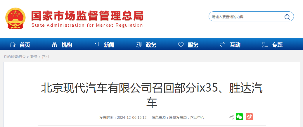 日前,北京現(xiàn)代汽車有限公司根據(jù)《缺陷汽車產(chǎn)品召回管理條例》和《缺陷汽車產(chǎn)品召回管理條例實施辦法》的要求,向國家市場監(jiān)督管理總局備案了召回計劃。決定自2024年12月30日起,召回2012年11月29日至2014年10月31日期間生產(chǎn)的2013款勝達汽車,共計139040輛;2010年3月28日至2014年8月14日期間生產(chǎn)的2010-2013款ix35汽車,共計420309輛。