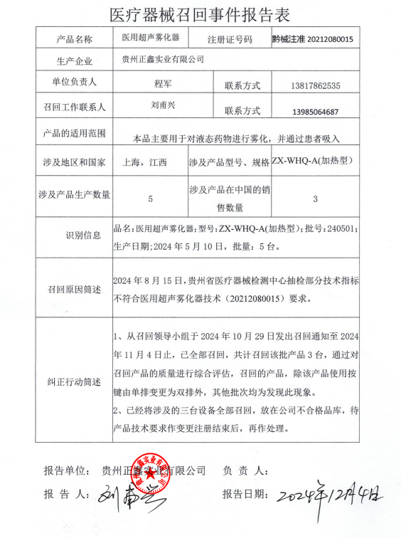 貴州正鑫實(shí)業(yè)有限公司對(duì)醫(yī)用超聲霧化器主動(dòng)召回