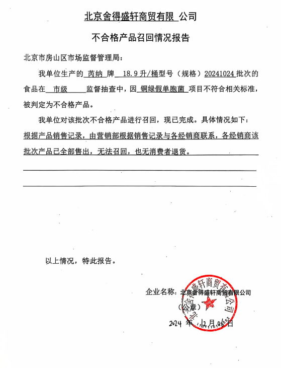 北京舍得盛軒不合格產(chǎn)品召回情況報(bào)告