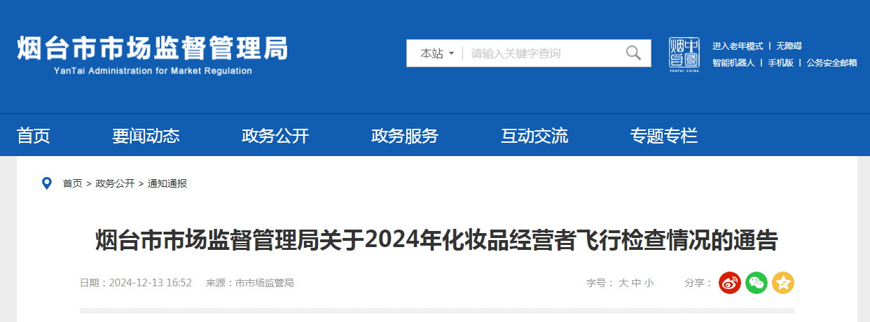 煙臺市市場監(jiān)督管理局關(guān)于2024年化妝品經(jīng)營者飛行檢查情況的通告