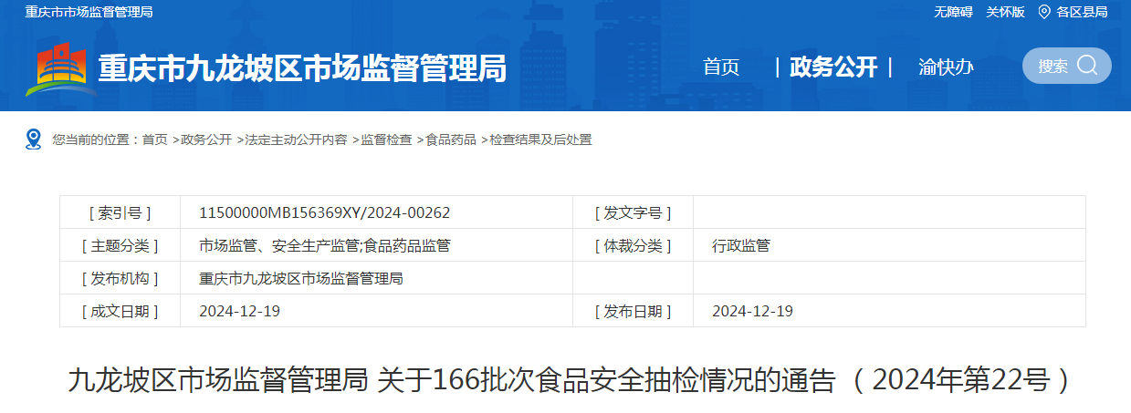 九龍坡區(qū)市場監(jiān)督管理局關(guān)于166批次食品安全抽檢情況的通告(2024年第22號)
