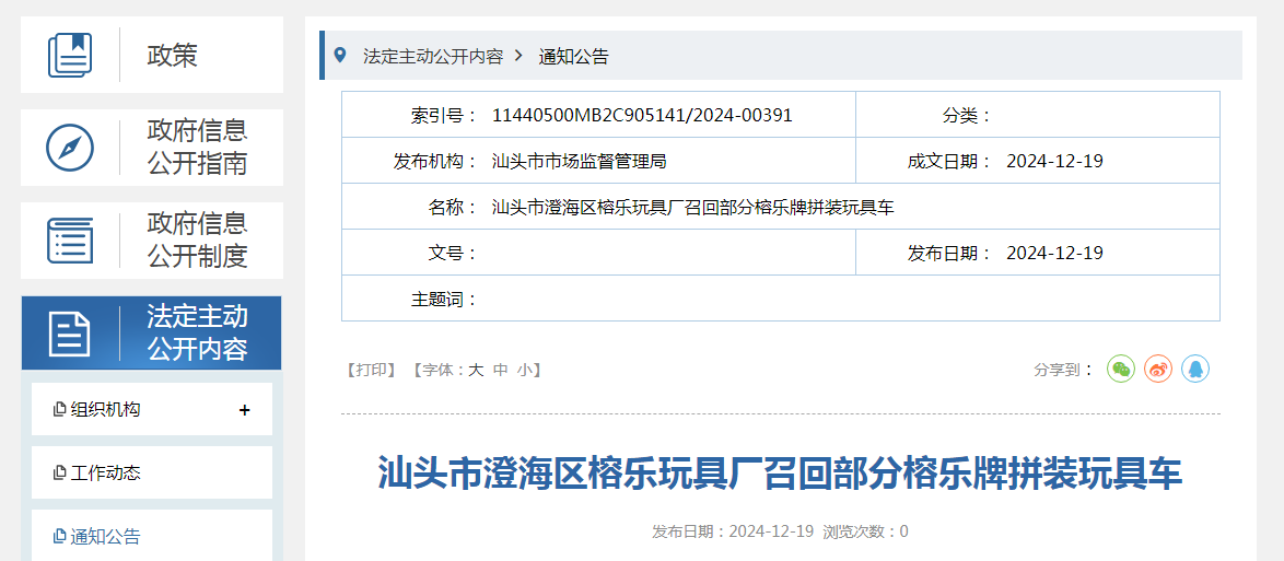 中國(guó)質(zhì)量新聞網(wǎng)訊 據(jù)廣東省汕頭市市場(chǎng)監(jiān)督管理局網(wǎng)站消息,日前,汕頭市澄海區(qū)榕樂玩具廠按照《消費(fèi)品召回管理暫行規(guī)定》的要求,主動(dòng)向汕頭市市場(chǎng)監(jiān)督管理局報(bào)告了召回計(jì)劃,將自即日起,召回2021年5月12日制造的部分榕樂牌拼裝玩具車,型號(hào):RL-05和RL-02,涉及數(shù)量為各48只。