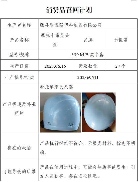 中國質(zhì)量新聞網(wǎng)訊 日前,藤縣樂恒強(qiáng)塑料制品有限公司受缺陷調(diào)查影響,按照《消費(fèi)品召回管理暫行規(guī)定》的要求,主動向廣西壯族自治區(qū)市場監(jiān)督管理局報告了召回計劃,將自即日起,召回2023年06月15日生產(chǎn)的部分“樂恒強(qiáng)”品牌摩托車乘員頭盔產(chǎn)品,規(guī)格為339MB類半盔,生產(chǎn)日期/批號為2023.06.15/202369511,涉及數(shù)量為27個。