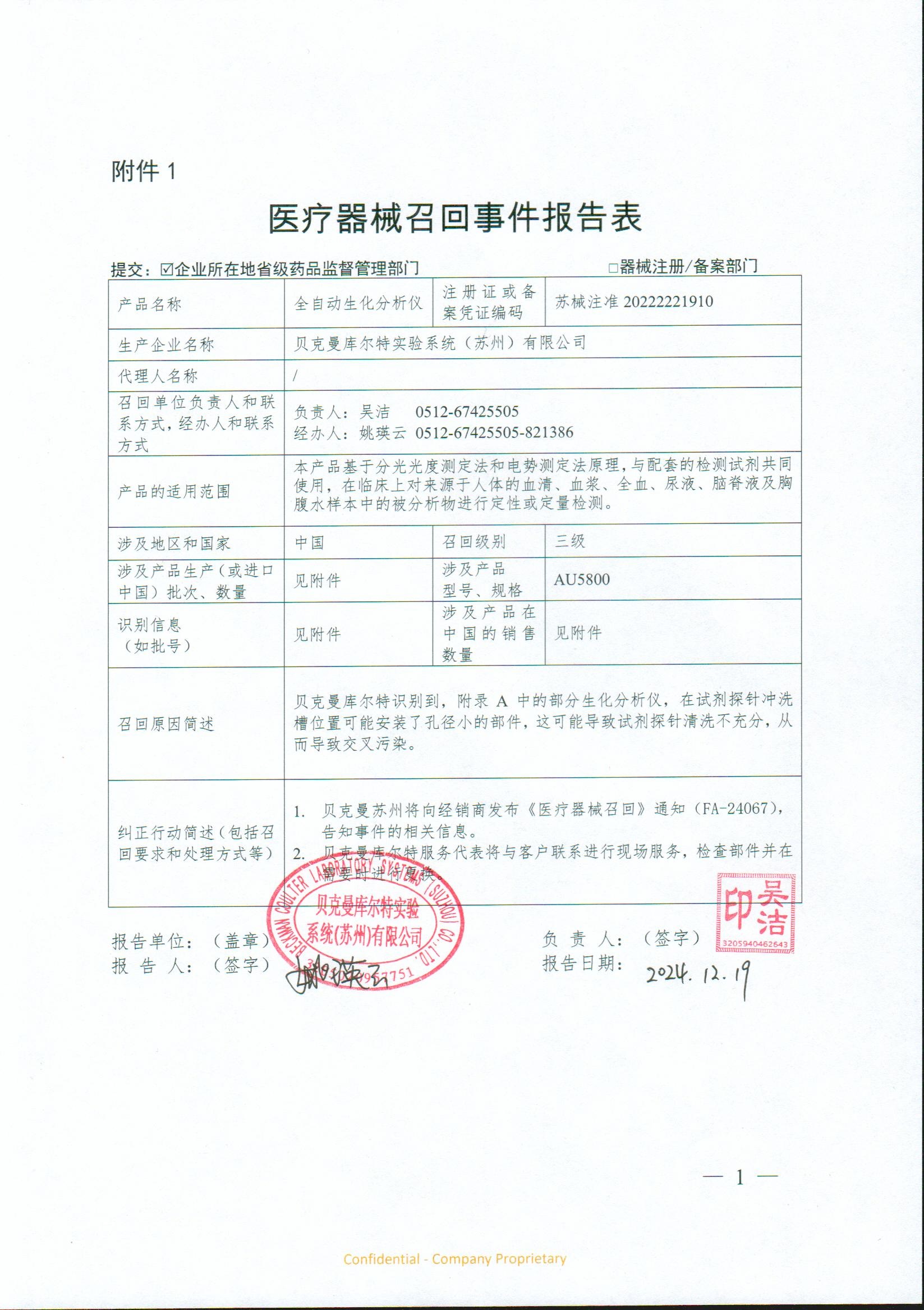 貝克曼庫(kù)爾特實(shí)驗(yàn)系統(tǒng)(蘇州)有限公司報(bào)告,該企業(yè)發(fā)現(xiàn)部分全自動(dòng)生化分析儀在試劑探針沖洗槽位置安裝了孔進(jìn)小的部件,可能導(dǎo)致試劑探針清洗不充分,造成交叉污染。貝克曼庫(kù)爾特實(shí)驗(yàn)系統(tǒng)(蘇州)有限公司對(duì)其生產(chǎn)的全自動(dòng)生化分析儀主動(dòng)召回,召回級(jí)別為三級(jí)。涉及產(chǎn)品的型號(hào)、規(guī)格及批次等詳細(xì)信息見(jiàn)《醫(yī)療器械召回事件報(bào)告表》