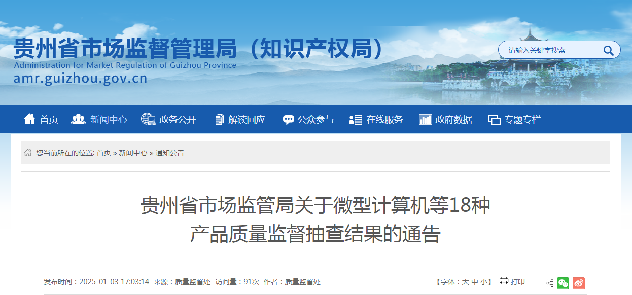 中國質(zhì)量新聞網(wǎng)訊 近日,貴州省市場監(jiān)管局公布微型計算機等18種產(chǎn)品質(zhì)量監(jiān)督抽查結果。