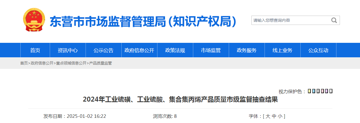 中國(guó)質(zhì)量新聞網(wǎng)訊 近日,山東省東營(yíng)市市場(chǎng)監(jiān)督管理局公布2024年工業(yè)硫磺、工業(yè)硫酸、集合集丙烯產(chǎn)品質(zhì)量市級(jí)監(jiān)督抽查結(jié)果。本次共抽查生產(chǎn)領(lǐng)域工業(yè)硫磺產(chǎn)品13批次、工業(yè)硫酸產(chǎn)品11批次、聚合集丙烯產(chǎn)品13批次。具體抽查結(jié)果見(jiàn)下表。