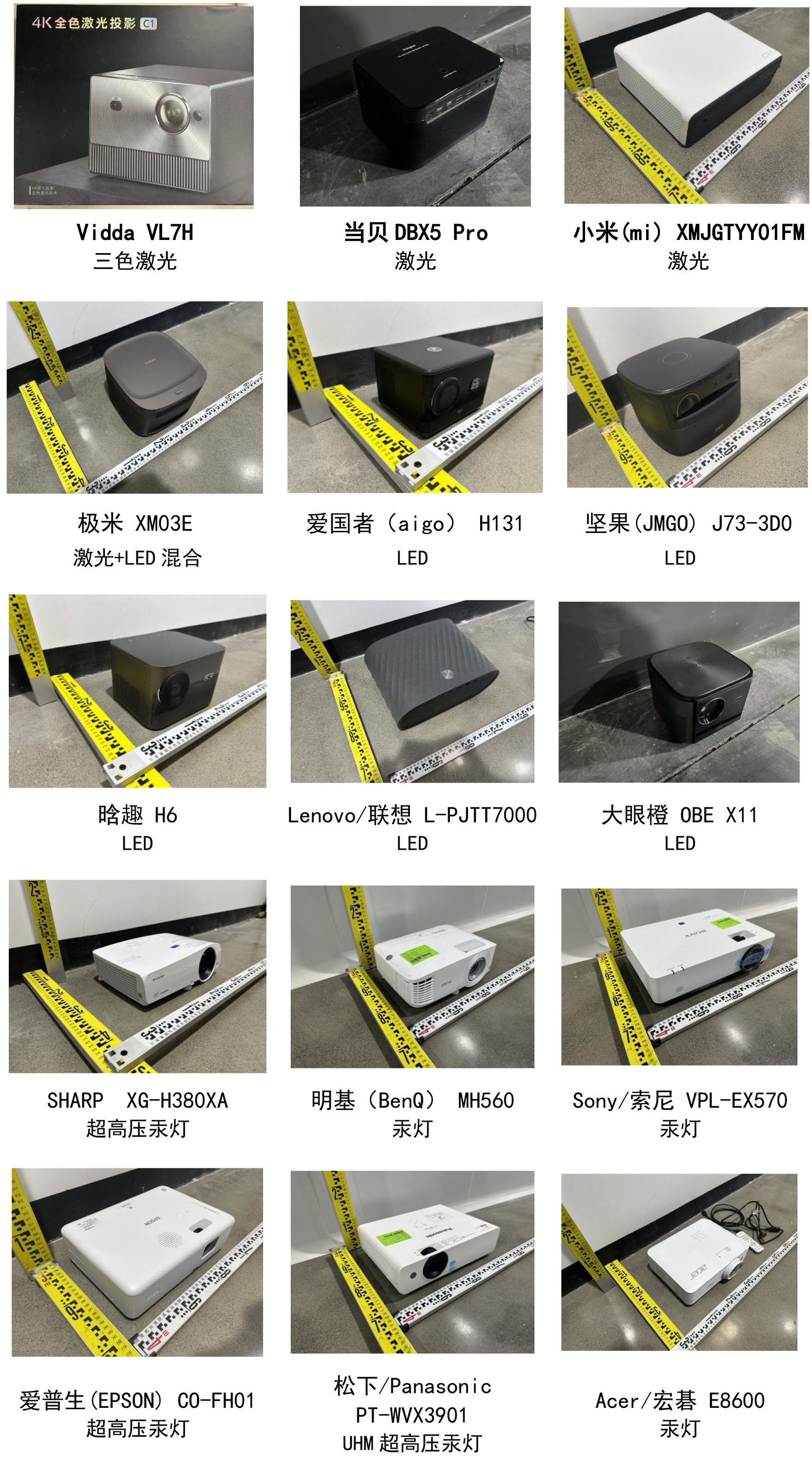 比較試驗(yàn)樣品由北京市消費(fèi)者協(xié)會(huì)的工作人員以普通消費(fèi)者的身份從電商平臺(tái)購(gòu)買了15個(gè)品牌的產(chǎn)品,主要來(lái)自天貓、淘寶、京東、蘇寧易購(gòu)、抖音等平臺(tái),購(gòu)買價(jià)格從4599元/臺(tái)到7199元/臺(tái),光源類型有激光、LED、激光+LED混合、汞燈四種,基本覆蓋了市面上的所有類型。