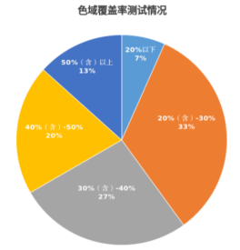 色域覆蓋率指色彩覆蓋的范圍,測(cè)量三基色(紅、藍(lán)、綠)投射出的最大色域面積占CIE1976均勻色彩空間全部光譜軌跡所對(duì)面積的百分比,數(shù)值越高,相對(duì)畫質(zhì)越好越鮮艷。本次對(duì)購(gòu)買的15臺(tái)投影機(jī)產(chǎn)品進(jìn)行檢驗(yàn),有10款未明示色域覆蓋率,測(cè)試結(jié)果中色域覆蓋率20%以下的樣品1臺(tái),色域覆蓋率20%(含)-30%之間有的樣品5臺(tái),色域覆蓋率30%(含)-40%之間有的樣品4臺(tái),色域覆蓋率40%(含)-50%之間有的樣品3臺(tái),色域覆蓋率50%(含)以上有的樣品2臺(tái),相對(duì)來(lái)說(shuō)色域覆蓋率越高,顏色呈現(xiàn)程度越濃郁,色域覆蓋率越低,顏色呈現(xiàn)程度越寡淡。