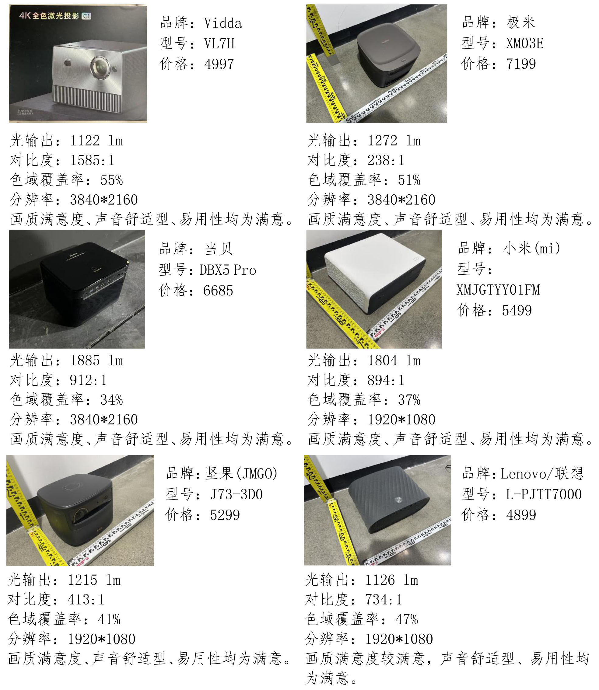 本次比較試驗(yàn)委托中家院(北京)檢測(cè)認(rèn)證有限公司對(duì)投影儀樣品的投影亮度(光輸出)、色域覆蓋率、對(duì)比度、分辨率、畫質(zhì)滿意度、聲音舒適性、易用性項(xiàng)目進(jìn)行了測(cè)試。
