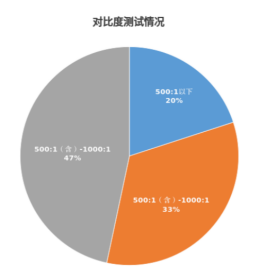 對(duì)比度是指投影機(jī)輸出圖像中最亮區(qū)域與最暗區(qū)域的亮度比值,能夠影響投影機(jī)的灰度層次表現(xiàn)和色彩層次表現(xiàn),一般來(lái)說(shuō),對(duì)比度越高,畫面景深越大也就會(huì)越生動(dòng)立體。本次對(duì)購(gòu)買的15臺(tái)投影機(jī)產(chǎn)品進(jìn)行檢驗(yàn),本次在出廠默認(rèn)狀態(tài)下進(jìn)行測(cè)試,故本次測(cè)試結(jié)果未與明示對(duì)比度進(jìn)行比較,其中有3臺(tái)樣機(jī)對(duì)比度在500:1以下,5臺(tái)樣機(jī)對(duì)比度在500:1(含)-1000:1之間,7臺(tái)樣機(jī)對(duì)比度在1000:1(含)以上。