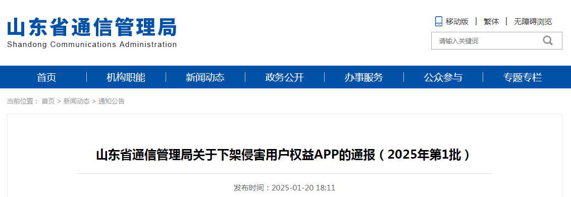 山東省通信管理局關(guān)于下架侵害用戶權(quán)益APP的通報(bào)(2025年第1批)