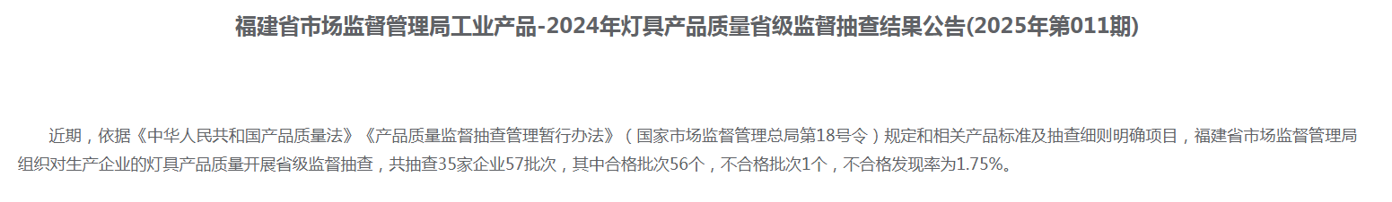 中國質(zhì)量新聞網(wǎng)訊 近日,福建省市場監(jiān)督管理局發(fā)布2024年燈具產(chǎn)品質(zhì)量省級監(jiān)督抽查結(jié)果(2025年第011期)。本次共抽查35家企業(yè)57批次,其中合格批次56個,不合格批次1個。