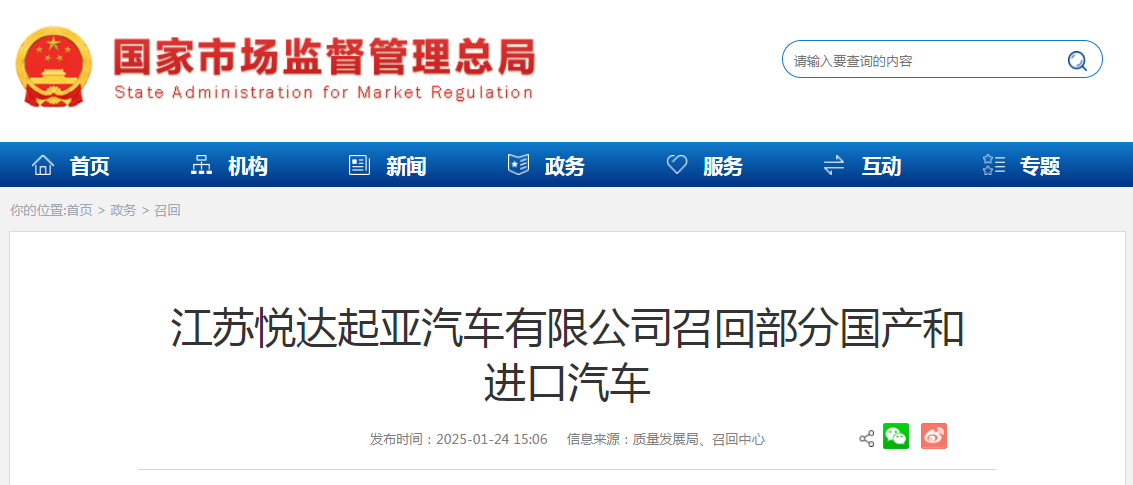 日前,江蘇悅達(dá)起亞汽車有限公司根據(jù)《缺陷汽車產(chǎn)品召回管理?xiàng)l例》和《缺陷汽車產(chǎn)品召回管理?xiàng)l例實(shí)施辦法》的要求,向國(guó)家市場(chǎng)監(jiān)督管理總局備案了召回計(jì)劃。決定自2025年2月10日起,召回以下車輛。