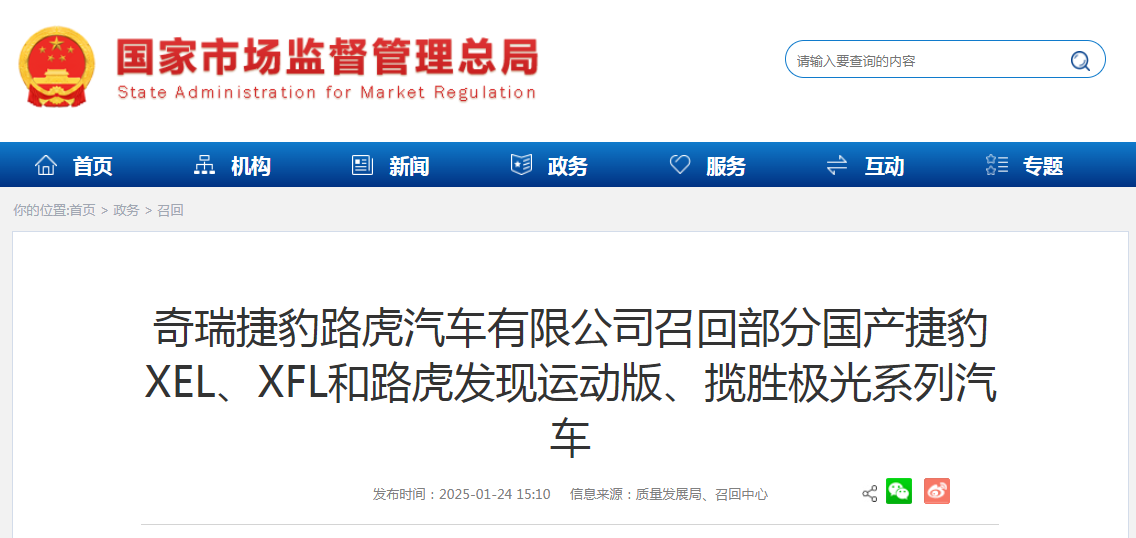 日前,奇瑞捷豹路虎汽車有限公司根據(jù)《缺陷汽車產(chǎn)品召回管理?xiàng)l例》和《缺陷汽車產(chǎn)品召回管理?xiàng)l例實(shí)施辦法》的要求,向國家市場監(jiān)督管理總局備案了召回計(jì)劃。決定自即日起,召回以下車輛。