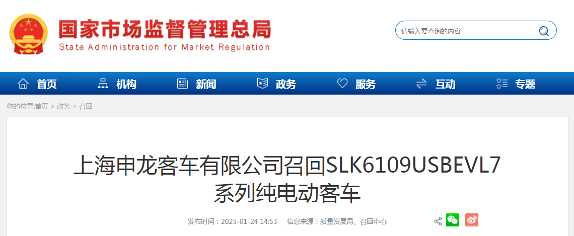 日前,上海申龍客車有限公司根據(jù)《缺陷汽車產(chǎn)品召回管理條例》和《缺陷汽車產(chǎn)品召回管理條例實施辦法》的要求,向國家市場監(jiān)督管理總局備案了召回計劃。決定自2025年1月30日起,召回2021年12月13日至2022年12月24日期間生產(chǎn)的SLK6109USBEVL7系列純電動客車,共計65輛。
