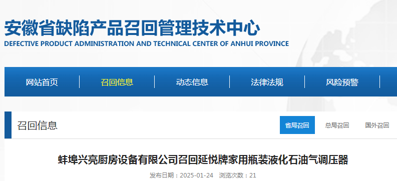 中國(guó)質(zhì)量新聞網(wǎng)訊 據(jù)安徽省缺陷產(chǎn)品召回管理技術(shù)中心網(wǎng)站消息,日前,蚌埠興亮廚房設(shè)備有限公司按照《消費(fèi)品召回管理暫行規(guī)定》的要求,向安徽省市場(chǎng)監(jiān)督管理局、蚌埠市市場(chǎng)監(jiān)督管理局報(bào)告了召回計(jì)劃,將自即日起,召回2024年6月生產(chǎn)的延悅牌家用瓶裝液化石油氣調(diào)壓器(型號(hào)JYT-0.6L),涉及數(shù)量為20個(gè)。