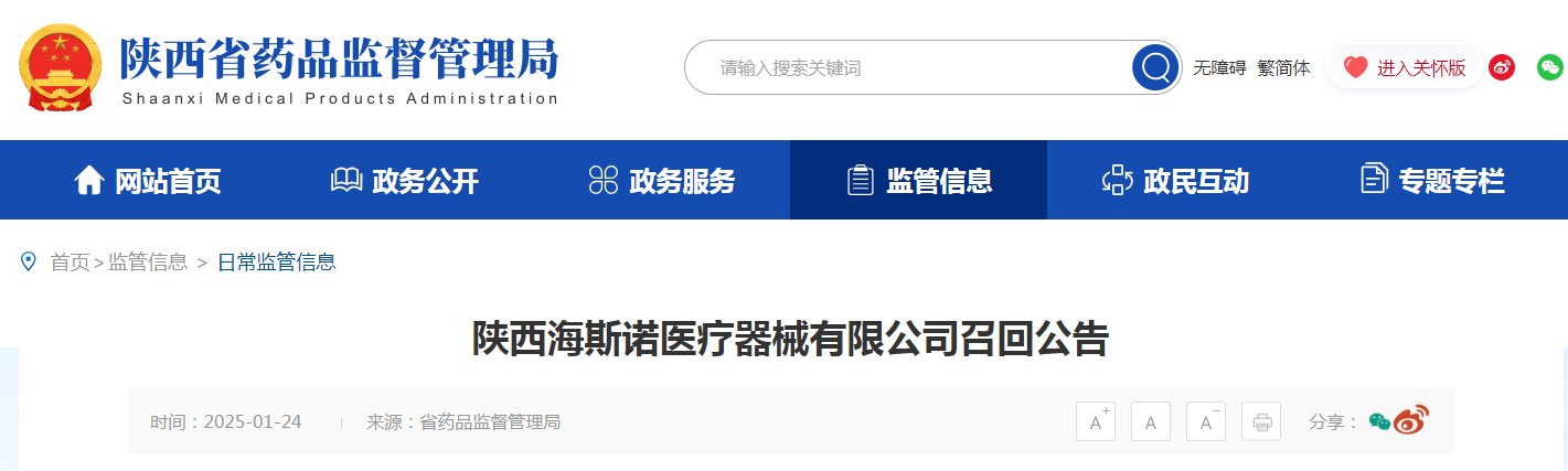 陜西海斯諾醫(yī)療器械有限公司2025年1月22日?qǐng)?bào)告,由于企業(yè)3款產(chǎn)品標(biāo)簽及說(shuō)明書(shū)與備案的相關(guān)內(nèi)容不一致,該企業(yè)對(duì)其生產(chǎn)的給藥器、醫(yī)用退熱凝膠、穴位壓力刺激器產(chǎn)品主動(dòng)召回。召回級(jí)別為三級(jí)。涉及產(chǎn)品的型號(hào)、規(guī)格及批次等詳細(xì)信息見(jiàn)《醫(yī)療器械召回事件報(bào)告表》。