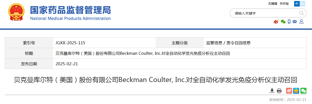 貝克曼庫(kù)爾特商貿(mào)(中國(guó))有限公司報(bào)告,由于產(chǎn)品沖洗轉(zhuǎn)盤(pán)混勻器無(wú)法自由旋轉(zhuǎn)、子系統(tǒng)通信故障等導(dǎo)致患者診斷或治療延誤的原因,生產(chǎn)商貝克曼庫(kù)爾特(美國(guó))股份有限公司Beckman Coulter, Inc.對(duì)其生產(chǎn)的全自動(dòng)化學(xué)發(fā)光免疫分析儀DxI 9000 Access Immunoassay Analyzer(國(guó)械注進(jìn)20242220249)主動(dòng)召回。召回級(jí)別為二級(jí)召回。本次召回涉及的產(chǎn)品未進(jìn)口至中國(guó),具體型號(hào)、規(guī)格及批次等詳細(xì)信息見(jiàn)《醫(yī)療器械召回事件報(bào)告表》。