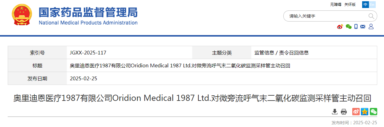 柯惠醫(yī)療器材國(guó)際貿(mào)易(上海)有限公司報(bào)告,由于采樣管從患者的氣管插管上斷開(kāi)困難的原因,生產(chǎn)商奧里迪恩醫(yī)療1987有限公司Oridion Medical 1987 Ltd.對(duì)其生產(chǎn)的微旁流呼氣末二氧化碳監(jiān)測(cè)采樣管Microstream CO2 sampling lines(國(guó)械注進(jìn)20182070157)主動(dòng)召回。召回級(jí)別為二級(jí)召回。本次召回涉及的產(chǎn)品未進(jìn)口至中國(guó),具體型號(hào)、規(guī)格及批次等詳細(xì)信息見(jiàn)《醫(yī)療器械召回事件報(bào)告表》。