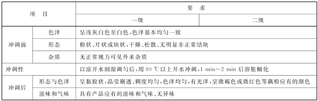 《藕粉質(zhì)量通則》(GB/T 25733-2022)對(duì)純藕粉沖調(diào)前后的感官要求做了規(guī)定