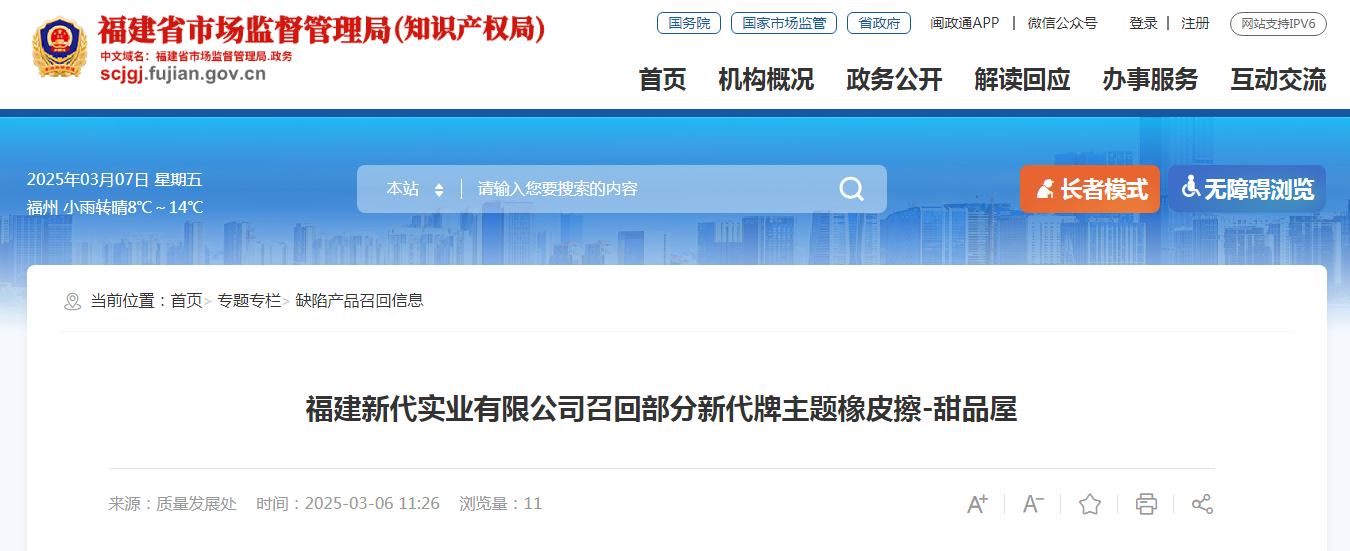 中國(guó)質(zhì)量新聞網(wǎng)訊 據(jù)福建省市場(chǎng)監(jiān)管局網(wǎng)站消息,日前,福建新代實(shí)業(yè)有限公司按照《消費(fèi)品召回管理暫行規(guī)定》的要求,向福建省市場(chǎng)監(jiān)督管理局報(bào)告了召回計(jì)劃,召回2022年1月1日至2022年3月31日生產(chǎn)的部分型號(hào)規(guī)格為AP133779-02的主題橡皮擦-甜品屋,涉及數(shù)量為2000盒。