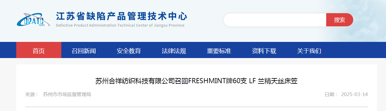 中國質(zhì)量新聞網(wǎng)訊 據(jù)江蘇省缺陷產(chǎn)品管理技術(shù)中心網(wǎng)站消息,日前,蘇州合祥紡織科技有限公司按照《消費品召回管理暫行規(guī)定》《江蘇省缺陷消費品召回管理辦法》的要求,主動向蘇州市市場監(jiān)督管理局報告了召回計劃,將自2025年3月14日起,召回2023年12月28日至2024年1月30日期間制造的FRESHMINT牌150cm*200cm*35cm藍色型60支LF蘭精天絲床笠,涉及數(shù)量為19328件。