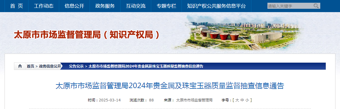 中國(guó)質(zhì)量新聞網(wǎng)訊 近日,太原市市場(chǎng)監(jiān)督管理局發(fā)布2024年貴金屬及珠寶玉器質(zhì)量監(jiān)督抽查信息。本次抽取貴金屬飾品、珠寶玉石飾品、鉆石飾品3大類共120批次產(chǎn)品。根據(jù)產(chǎn)品質(zhì)量國(guó)家標(biāo)準(zhǔn)檢驗(yàn)和判定:合格產(chǎn)品104批次、不合格產(chǎn)品16批次(含1批次拒檢)。