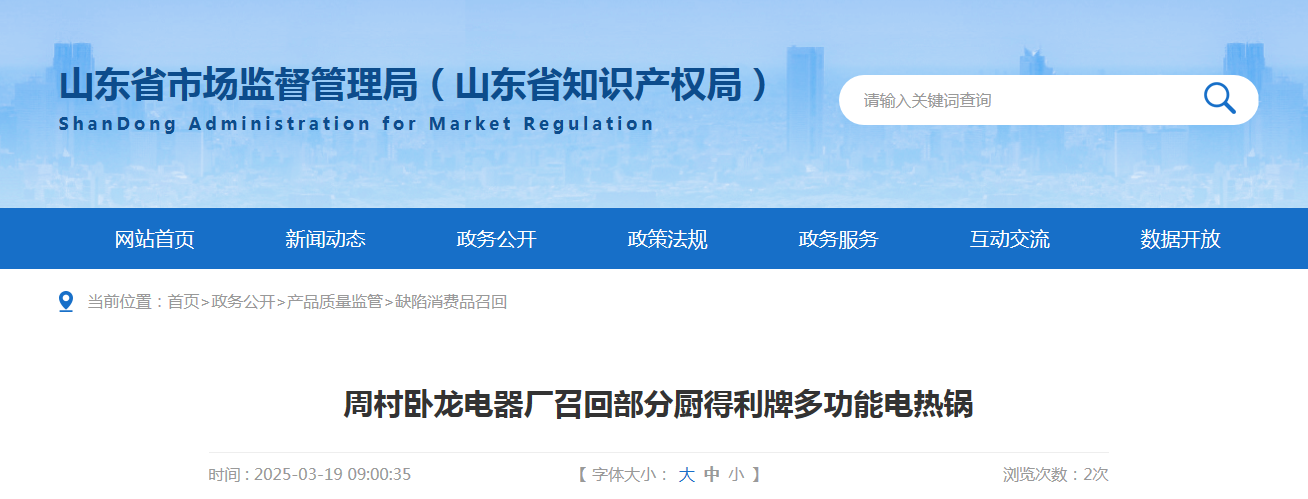 中國質(zhì)量新聞網(wǎng)訊 據(jù)山東省市場監(jiān)管局網(wǎng)站消息,日前,周村臥龍電器廠按照《消費品召回管理暫行規(guī)定》的要求,主動向山東省市場監(jiān)督管理局報告了召回計劃,將自即日起,召回2023年3月1日至2023年3月10日期間制造的部分廚得利牌WLDG-2100型多功能電熱鍋,涉及數(shù)量為20臺。