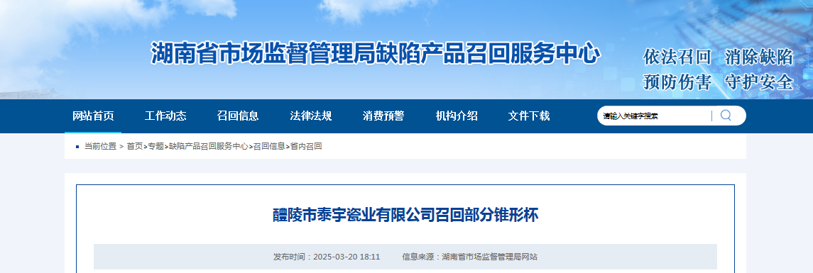 中國(guó)質(zhì)量新聞網(wǎng)訊 據(jù)湖南省市場(chǎng)監(jiān)督管理局缺陷產(chǎn)品召回服務(wù)中心網(wǎng)站消息,日前,醴陵市泰宇瓷業(yè)有限公司按照《消費(fèi)品召回管理暫行規(guī)定》的要求,向湖南省市場(chǎng)監(jiān)督管理局報(bào)告了召回計(jì)劃,將自即日起,召回2024年7月29日制造的錐形杯,涉及數(shù)量為1000個(gè)。