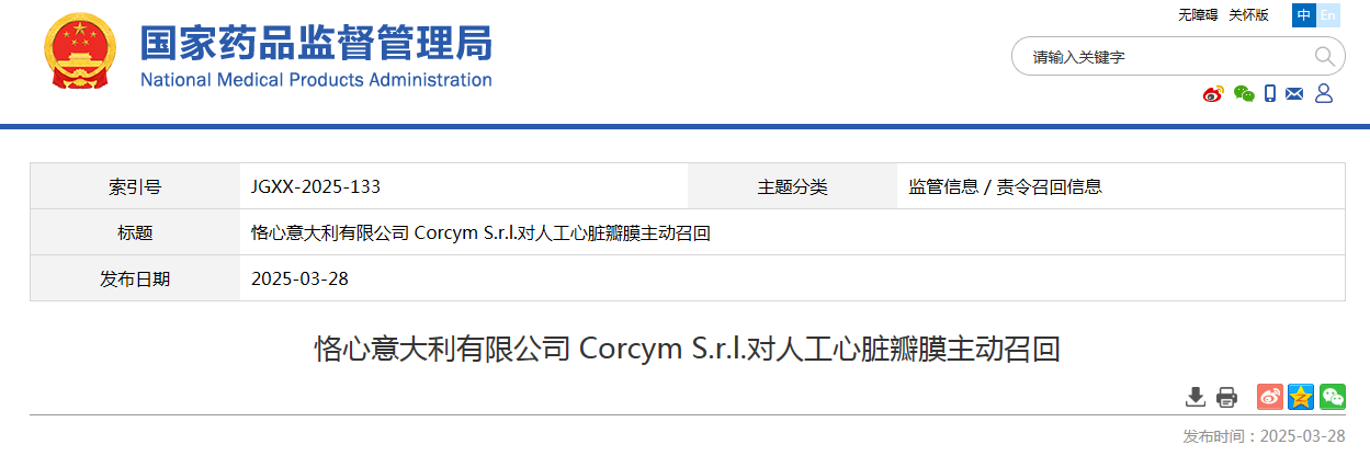 恪心醫(yī)療科技(上海)有限公司報(bào)告,由于產(chǎn)品瓣葉熱解碳涂層厚度可能低于規(guī)范要求的原因,生產(chǎn)商恪心意大利有限公司 Corcym S.r.l.對(duì)其生產(chǎn)的人工心臟瓣膜Optiform Prosthetic Heart Valve(國械注進(jìn)20163132339)主動(dòng)召回。召回級(jí)別為一級(jí)召回。受影響產(chǎn)品未使用,已隔離存放于庫房。涉及產(chǎn)品的型號(hào)、規(guī)格及批次等詳細(xì)信息見《醫(yī)療器械召回事件報(bào)告表》。