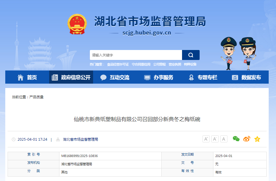 中國(guó)質(zhì)量新聞網(wǎng)訊 據(jù)湖北省市場(chǎng)監(jiān)管局網(wǎng)站消息,日前,仙桃市新典紙塑制品有限公司按照《消費(fèi)品召回管理暫行規(guī)定》的要求,主動(dòng)向湖北省市場(chǎng)監(jiān)督管理局備案了召回計(jì)劃,將自即日起,召回2024年7月23日生產(chǎn)的新典冬之梅紙碗,品牌:新典,規(guī)格:40X40X41.5cm/個(gè),生產(chǎn)批號(hào):2024-07-23,涉及數(shù)量為11000袋。