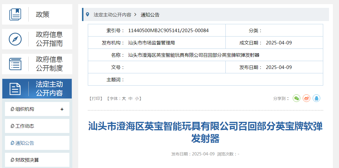 中國(guó)質(zhì)量新聞網(wǎng)訊 據(jù)廣東省汕頭市市場(chǎng)監(jiān)督管理局網(wǎng)站消息,日前,汕頭市澄海區(qū)英寶智能玩具有限公司按照《消費(fèi)品召回管理暫行規(guī)定》的要求,主動(dòng)向汕頭市市場(chǎng)監(jiān)督管理局報(bào)告了召回計(jì)劃,將自即日起,召回2024年3月13日至2024年3月19日期間制造的部分英寶牌軟彈發(fā)射器,型號(hào):PS—014—H,涉及數(shù)量為39只。