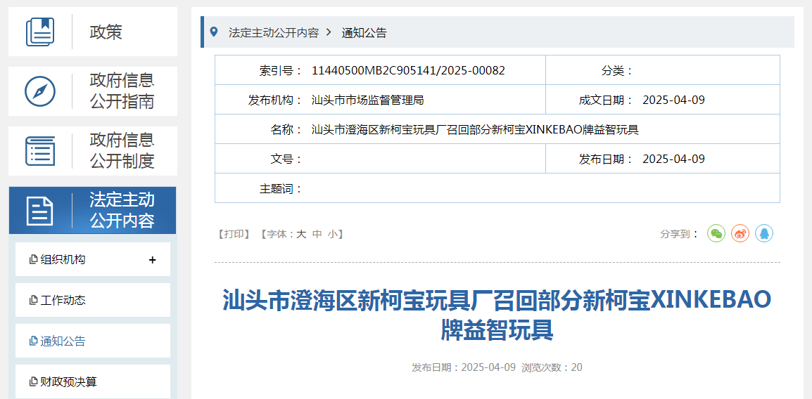 用戶可通過汕頭市澄海區(qū)新柯寶玩具廠客戶服務(wù)熱線(0754-82211850)咨詢持有的產(chǎn)品是否在受影響范圍內(nèi)或進(jìn)一步了解具體情況。此外,用戶可登錄汕頭市市場監(jiān)督管理局網(wǎng)站“政務(wù)公開—重點(diǎn)領(lǐng)域信息公開—產(chǎn)品質(zhì)量信息”欄目了解更多信息,也可撥打汕頭市市場監(jiān)督管理局缺陷產(chǎn)品召回工作聯(lián)系電話(0754—88545860)反映召回活動實(shí)施過程中的問題或提交缺陷線索。