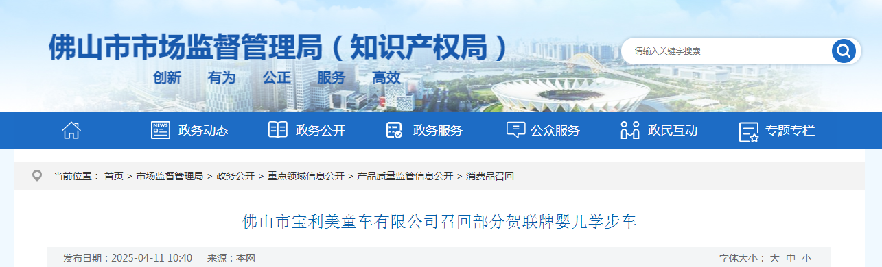 中國(guó)質(zhì)量新聞網(wǎng)訊 據(jù)廣東省佛山市市場(chǎng)監(jiān)管局網(wǎng)站消息,日前,佛山市寶利美童車有限公司按照《消費(fèi)品召回管理暫行規(guī)定》的要求,主動(dòng)向佛山市市場(chǎng)監(jiān)督管理局報(bào)告了召回計(jì)劃,將自即日起,召回2022年6月1日至2022年6月3日制造的部分賀聯(lián)牌666型號(hào)嬰兒學(xué)步車,涉及數(shù)量為50臺(tái)。