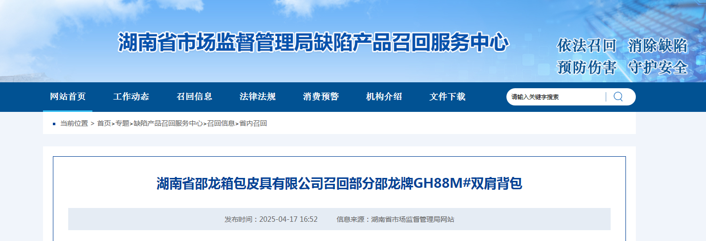 中國質(zhì)量新聞網(wǎng)訊 據(jù)湖南省市場監(jiān)督管理局缺陷產(chǎn)品召回服務(wù)中心網(wǎng)站消息,日前,湖南省邵龍箱包皮具有限公司按照《消費品召回管理暫行規(guī)定》的要求,主動向湖南省市場監(jiān)督管理局報告了召回計劃,將自即日起,召回2024年7月21日生產(chǎn)的邵龍牌雙肩背包(型號:GH88M#),涉及數(shù)量為100個。?