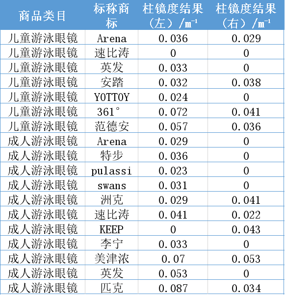 在球鏡度和球鏡度互差方面,兒童游泳眼鏡中的Arena、速比濤、英發(fā)、安踏等品牌表現(xiàn)較優(yōu) ;