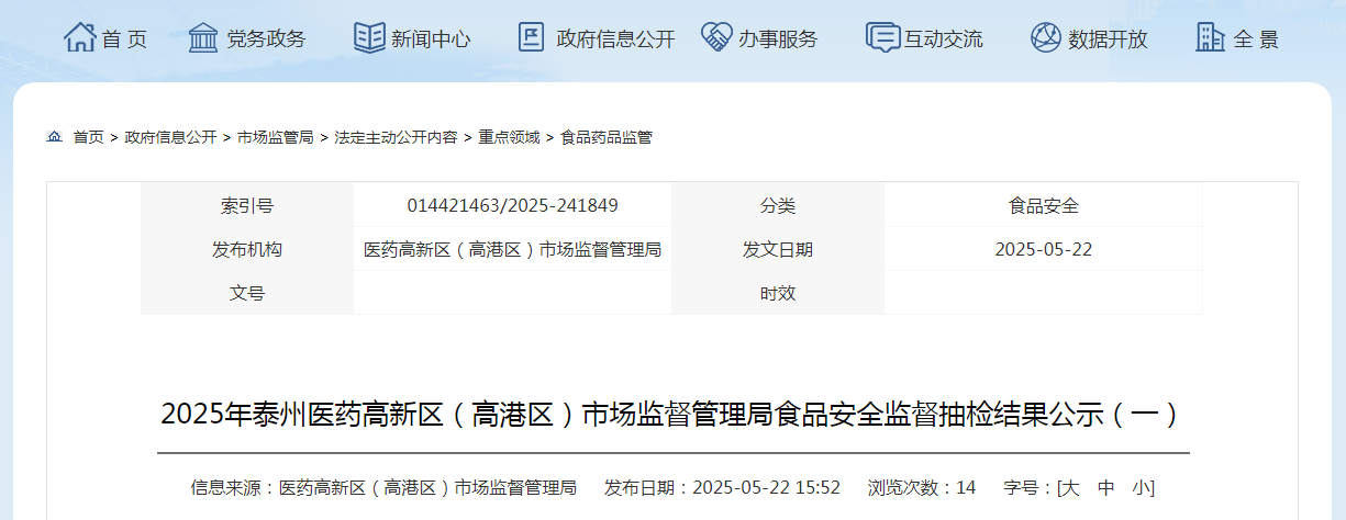 2025年泰州醫(yī)藥高新區(qū)(高港區(qū))市場(chǎng)監(jiān)督管理局食品安全監(jiān)督抽檢結(jié)果公示(一)