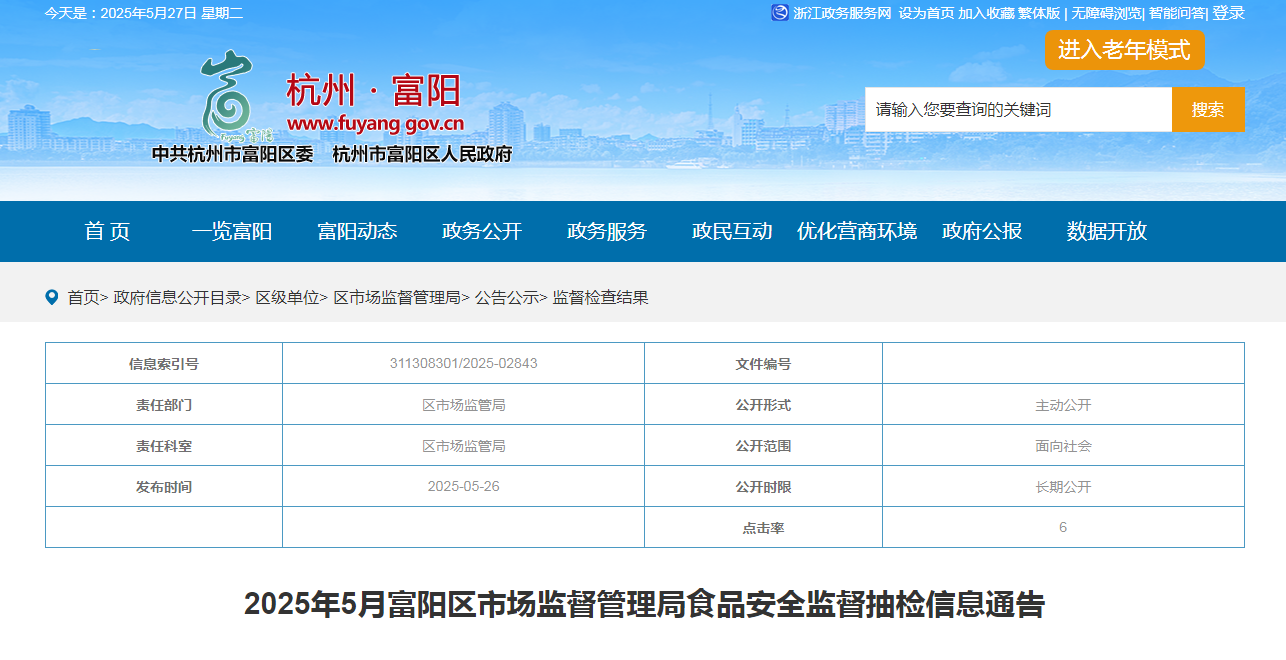 2025年5月富陽(yáng)區(qū)市場(chǎng)監(jiān)督管理局食品安全監(jiān)督抽檢信息通告