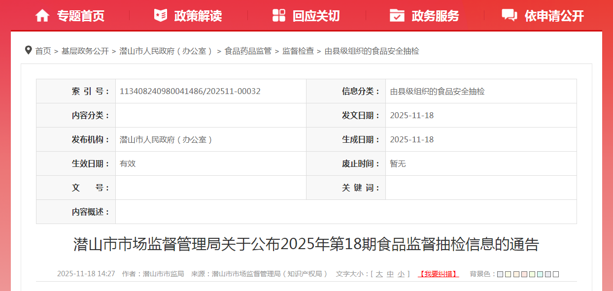 潛山市市場監(jiān)督管理局關(guān)于公布2025年第18期食品監(jiān)督抽檢信息的通告