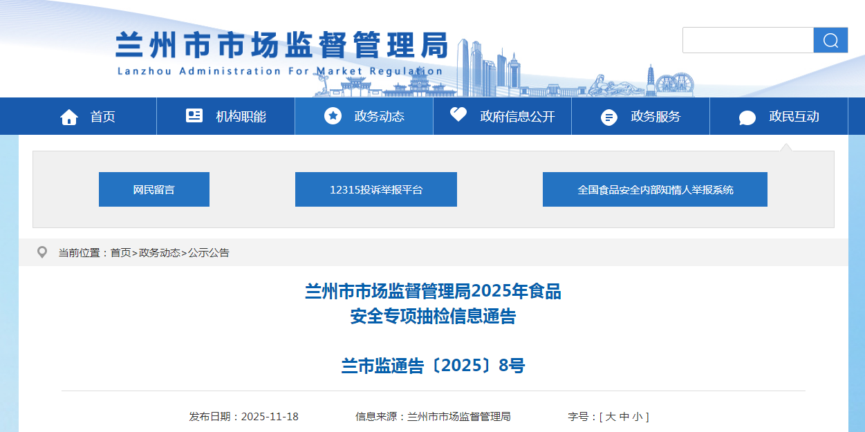 蘭州市市場(chǎng)監(jiān)督管理局2025年食品安全專項(xiàng)抽檢信息通告 蘭市監(jiān)通告〔2025〕8號(hào)