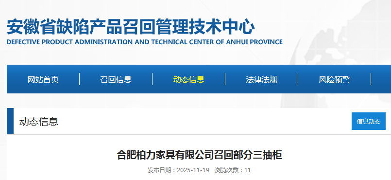 中國質(zhì)量新聞網(wǎng)訊 據(jù)安徽省缺陷產(chǎn)品召回管理技術(shù)中心網(wǎng)站消息,日前,合肥柏力家具有限公司按照《消費(fèi)品召回管理暫行規(guī)定》的要求,向安徽省市場(chǎng)監(jiān)督管理局、合肥市市場(chǎng)監(jiān)督管理局報(bào)告了召回計(jì)劃,將自即日起,召回2025年2月5日生產(chǎn)的三抽柜(規(guī)格:400×440×605mm),涉及數(shù)量10件。