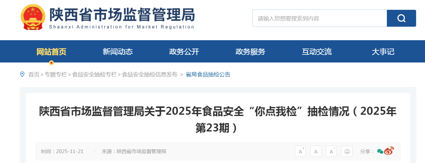 陜西省市場監(jiān)督管理局關(guān)于2025年食品安全“你點我檢”抽檢情況(2025年第23期)