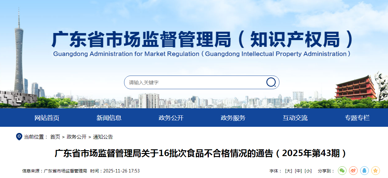 廣東省市場監(jiān)督管理局關(guān)于16批次食品不合格情況的通告(2025年第43期)