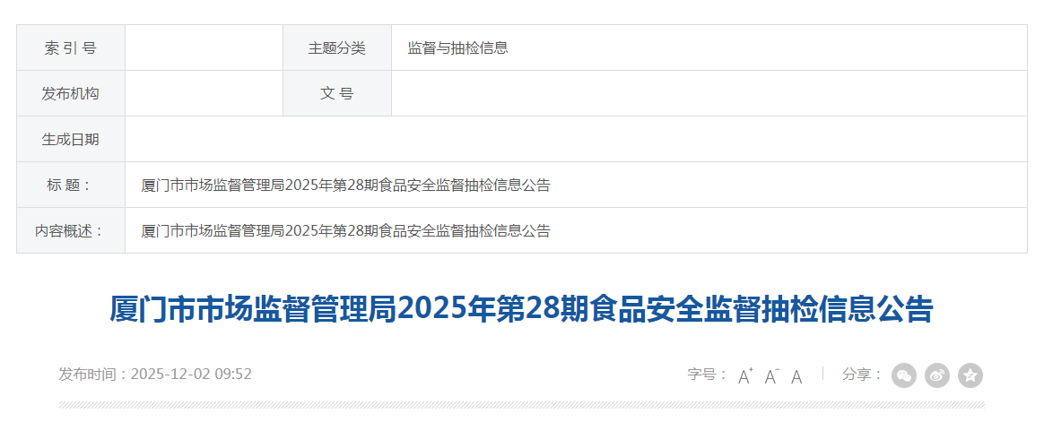 廈門(mén)市市場(chǎng)監(jiān)督管理局2025年第28期食品安全監(jiān)督抽檢信息公告