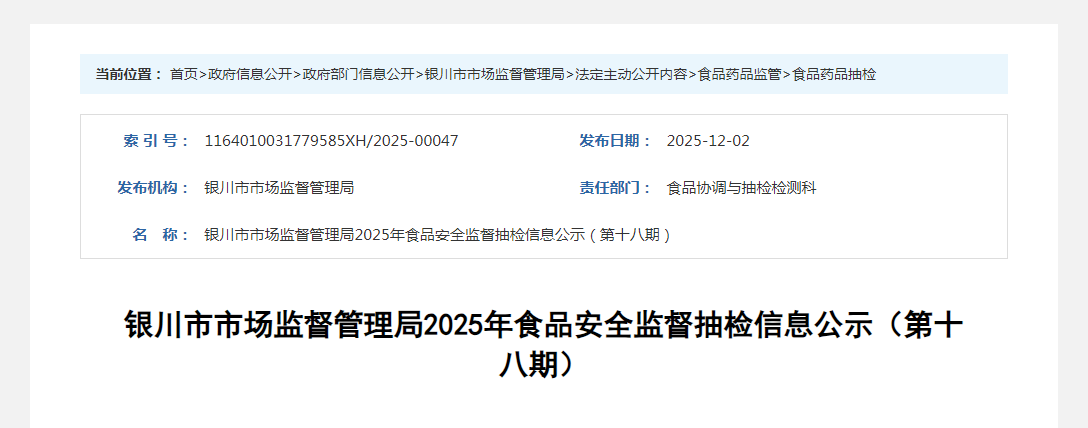 銀川市市場(chǎng)監(jiān)督管理局2025年食品安全監(jiān)督抽檢信息公示(第十八期)