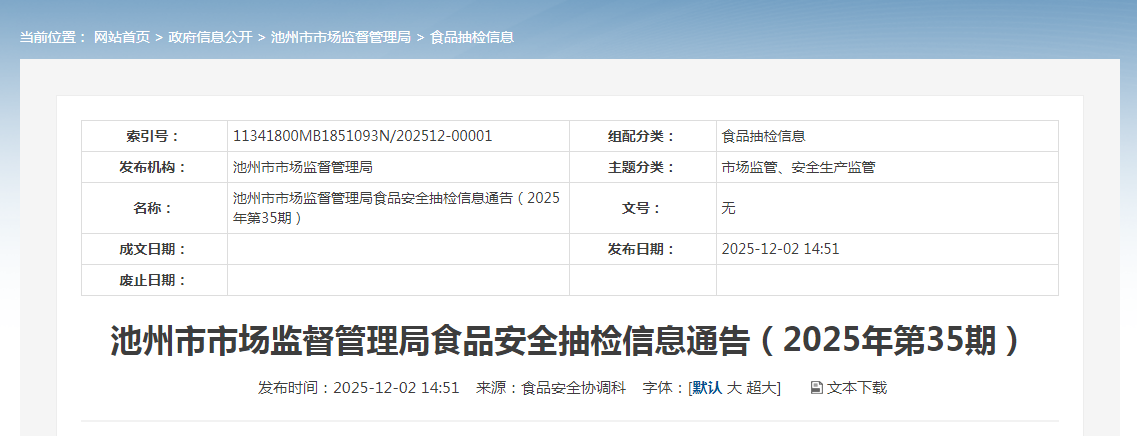 池州市市場(chǎng)監(jiān)督管理局食品安全抽檢信息通告(2025年第35期)