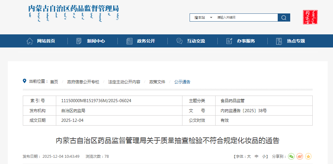 內(nèi)蒙古自治區(qū)藥品監(jiān)督管理局關(guān)于質(zhì)量抽查檢驗(yàn)不符合規(guī)定化妝品的通告