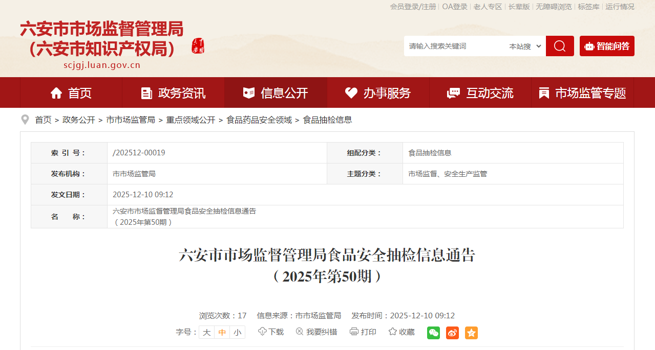 六安市市場監(jiān)督管理局食品安全抽檢信息通告(2025年第50期)