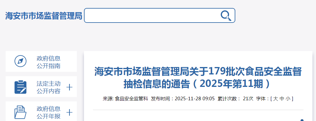 海安市市場(chǎng)監(jiān)督管理局關(guān)于179批次食品安全監(jiān)督抽檢信息的通告(2025年第11期)