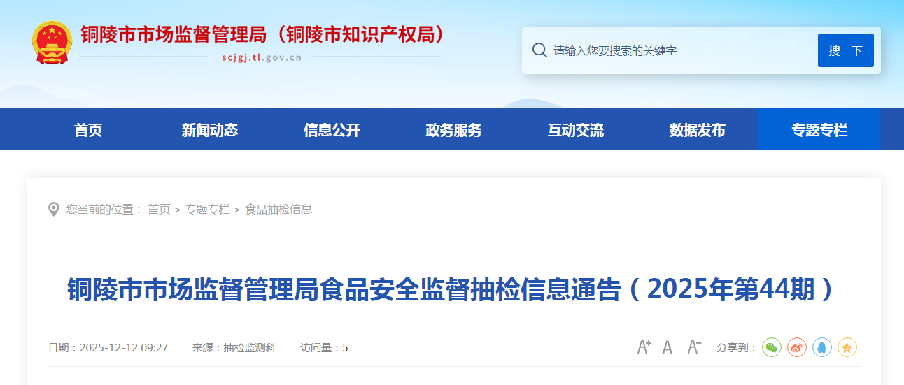 銅陵市市場(chǎng)監(jiān)督管理局食品安全監(jiān)督抽檢信息通告(2025年第44期)
